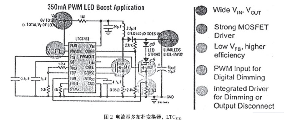 LTC3783是帶恒流PWM調光的電流型多拓撲變換器(圖2),用于驅動大功率LED燈串。本項專利技術可提供非常快而準確的負載切換,不會產生瞬時的欠電壓或過電壓,能數字式達到3000∶1的調光率(100Hz),純色的PWM調光可確保白色LED和紅綠藍(RGB) LED的顏色完整性。LTC3783利用模擬控制,容許附加100∶1的調光比,因人眼對周圍光線的變化很敏感,故這一比率必不可少。該多功能的控制器可用于升壓、降壓、升降壓雙向變換器或反激式(Flyback)變換器,或作為恒流/恒壓的調節器。利用MOSFET的通態電阻(on-resistance)可取消傳感電流的電阻器,并提高了效率。LTC3783芯片的應用還包括:高電壓LED陣列和LED背光,以及在電訊、自動化與工業控制系統中的調節器。