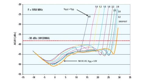 圖5:功率放大器的供電電壓和POUT怎樣影響ACLR |
