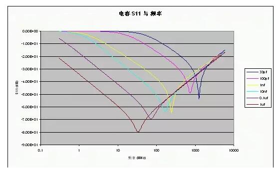 給出了不同容值下的典型S11參數,從這些曲線可以清楚地看到SRF,還可以看出電容越大,在較低頻率處所提供的去耦性能越好(所呈現的阻抗越低)。