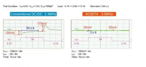 此外,因為FPGA或ASIC的負載電流會瞬間變化,瞬態電壓波動會增大。以前的DC/DC轉換器為了控制瞬態電壓波動,需要大容量輸出電容,因此出現了安裝面積增大的問題。