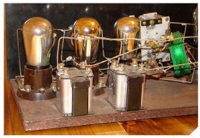 圖A.早期使用木制試驗(yàn)板技術(shù)構(gòu)建的無線電接收器。需要注意的是,真空管板電壓可以高達(dá)300 V dc,因此在施加電源后必須小心謹(jǐn)慎。