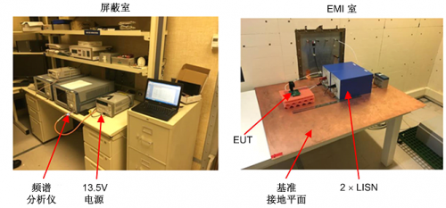 圖 6 顯示了用于預合規測試的 CISPR 25 傳導發射試驗室。LISN 是右側的藍色箱體,鋰離子汽車電池位于其后,DUT 位于左側的絕緣材料上。為了在特定電源電壓下(例如 13.5V)進行測試,使用可變電壓源從試驗室外部通過隔板饋電。結果通過各自的 LISN 在線路端(熱回路)和返回端(接地)獲取。